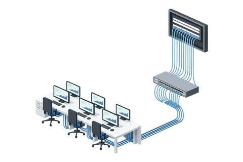 ビジネスLANスイッチは、社内のPCやサーバー、複合機などを有線で接続し、ネットワークを安定的に拡張する機器です。複数ポートで通信を効率よく振り分け、混雑による遅延を抑制。VLANやQoS、ループ防止などの管理機能に対応したモデルもあり、部署分離や音声・映像の優先制御など業務に最適なネットワーク構築を支えます。